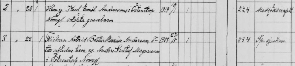 Det var då jag såg det. På raden ovanför står att ett annat barn dog i familjen bara två dagar tidigare. ”Hem.eg. Karl Emil Anderssons i Östanstorp Norreg. odöpta gossebarn”, står det. Han hade fötts den 19 januari och dött dagen efter. Det verkar som om prästen (av förklarliga skäl) hade hållit sig undan så att barnet inte blev döpt.