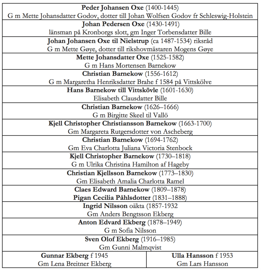 Johan Pedersen Oxes son Johan Johansen Oxe fick en dotter Anne Johansen Oxe som av sin man fick Oxholms gods på Nordjylland uppkallat efter sig. Gunnar är bördig efter Anne Johansen Oxes syster Mette Johansdatter Oxe, som gifte sig med Hans Barnekow, som var född på Ralsvik på Rügen.