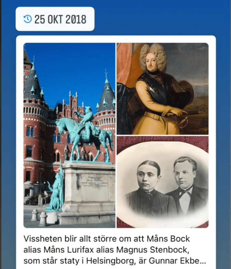 ”Vissheten blir allt större om att Måns Bock alias Måns Lurifax alias Magnus Stenbock, som står staty i Helsingborg, är Gunnar Ekbergs och Ulla Hanssons farfars morfars farfars morfar.”