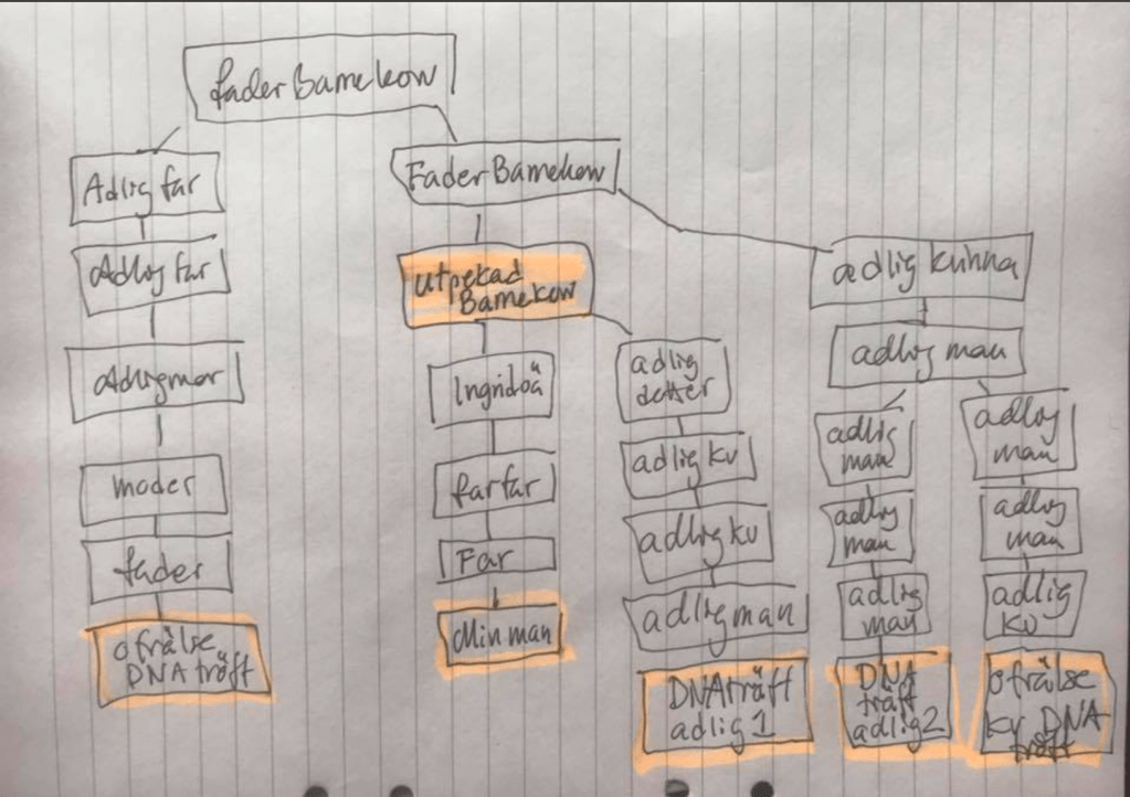Sammantaget hade vi nu ett enormt nätverk av dna-träffar som ledde till den skyldige: Claes Edward Barnekow och där jag i samma veva tillsammans med en annan släktforskare i Lund lyckades bevisa att en dräng på Torups slott var far till Ingrid Nilssons blivande make Anders Bengtsson Ekberg, som även han fötts oäkta.