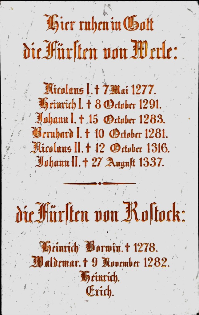 Heinrich Borwin II fick flera barn. Gunnars anfader blir sonen Nicolaus I som blir Herr zu Rostock 1229 och 1234 Herr zu Werle. Nicolaus zu Werle ligger begravd i Doberaner Münster i Bad Doberan, som vi också besökte. Hans son Heinrich I zu Werle ligger också begravd där. Han var gift med svenska Rikissa Birgersdotter av Bjälboätten, dotter till Birger Jarl, och blev mördad av sina söner 1291 under en jakt i Saal.