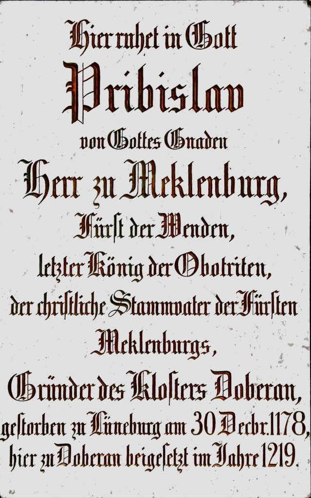 Pribislaw är stamfader till furstarna av Mecklenburg. Han grundar klostret Doberan, dör 1178 och begravs i kyrkan 1219.