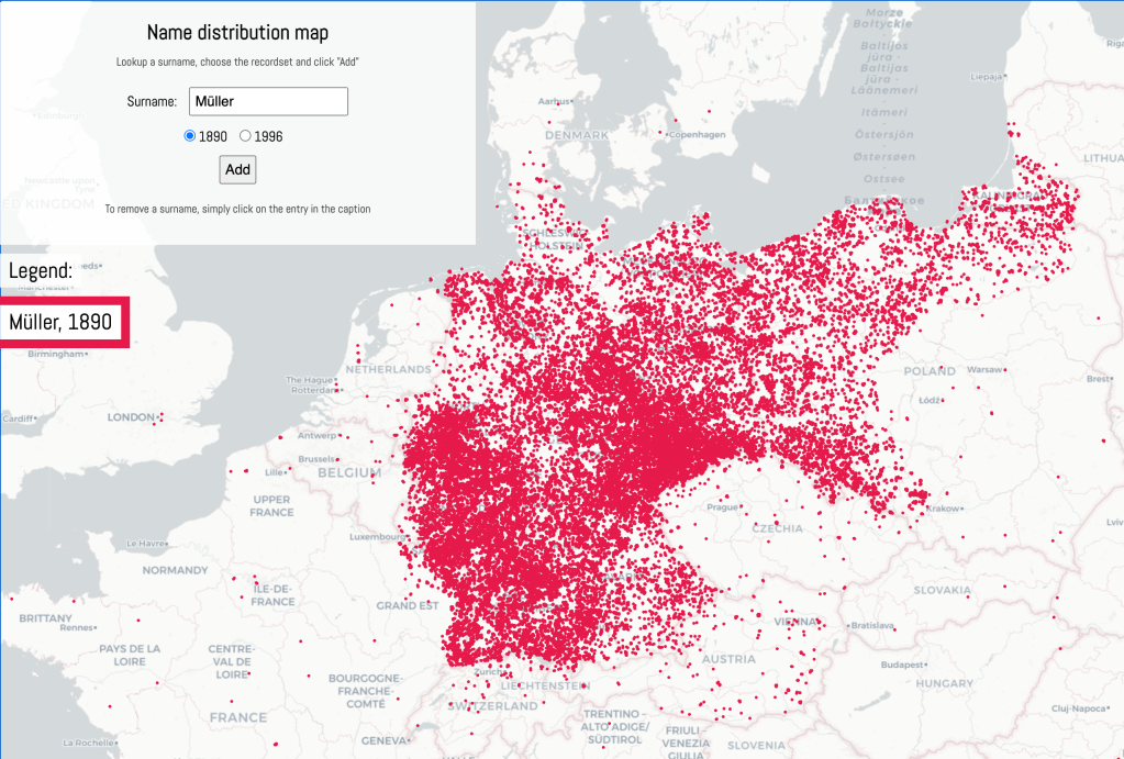Namenverbreitungskarte skapat av Verein für Computergenealogie är ett fantastiskt redskap för att härleda familjenamns härkomst. Dock ej för namnet Müller.